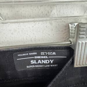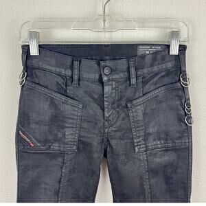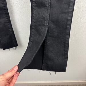 Stretch denim, button fly, low rise, cropped, raw split-front hem, pierced side details, pockets, size 25.