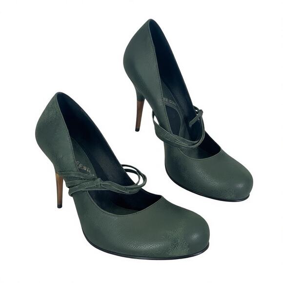 Vintage-inspired Diesel suede Mary Jane heels in a deep slate gray with a unique wood stiletto heel and wrap-style strap. A rare larger size find with an edgy Diesel aesthetic. Beautiful, sculptural shape and high-quality construction.