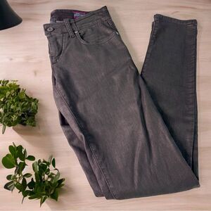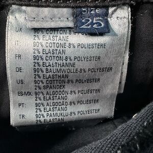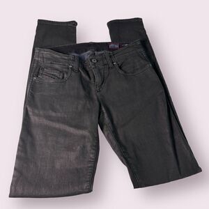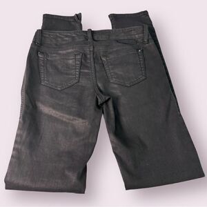 Look new. Leather look jeans with stretch. Waist is 25. Inseam is 31.5”.Skinny fit. Low rise.