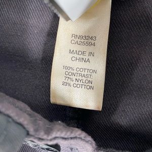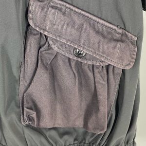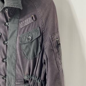 Loop button closure. Extra pockets. Mixed fabrics. Cinch waist.