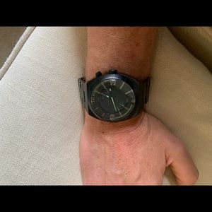 Men’s Diesel watch charcoal/black steel band with 43mm black face and neon green highlights. Cool red light feature to be able to see in the dark.