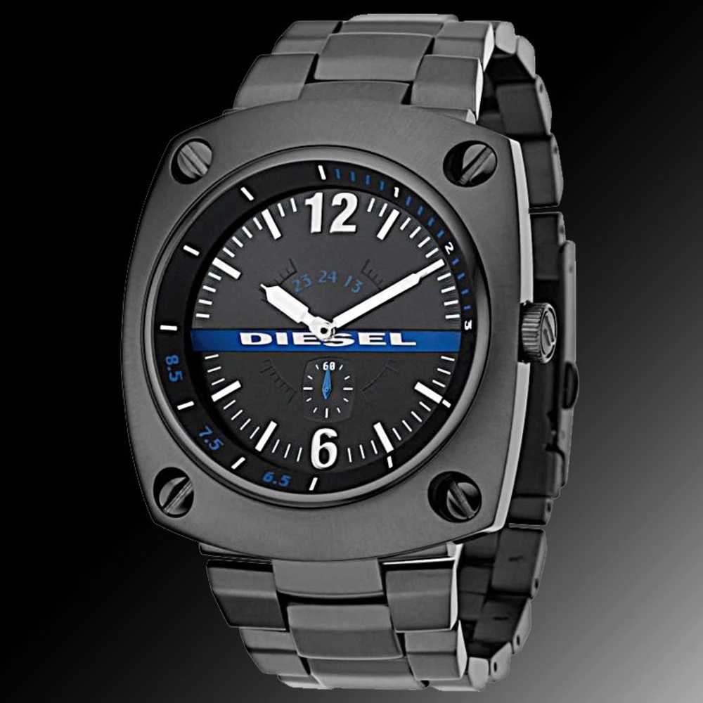 This watch features a domed case that aesthetically matches the thick domed crystal. Stainless steel and black IP case and bracelet. Black layered, sunray dial with black applied indexes. Bright blue sub-second hand. 48mm. 10 ATM.