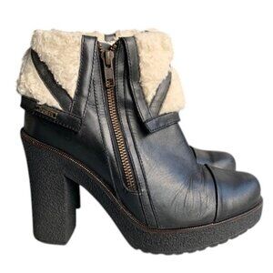 Diesel Women’s 36 US 6 Black Leather Ankle Boots Faux Fur Heel Zip Up Italy