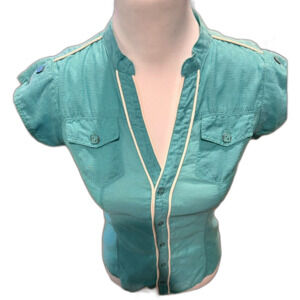 Diesel Y2K Textured Button Front Blouse XXS Green Cap Sleeve Trim 00s Vintage Top