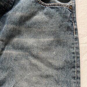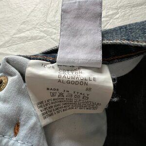 Diesel Industry jeans, straight leg, distressed denim, button fly, 100% cotton, size 38, made in Italy, waist flat: 19", rise: 11", inseam: 30", preowned and has a small spot on the leg - see photos