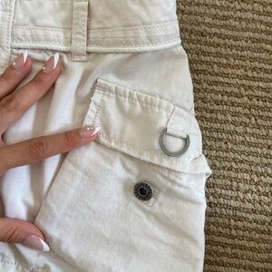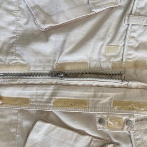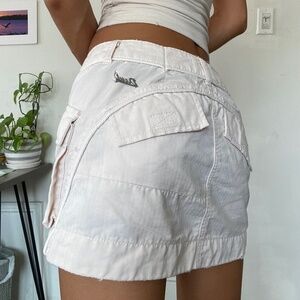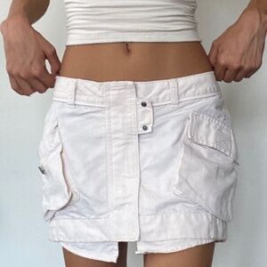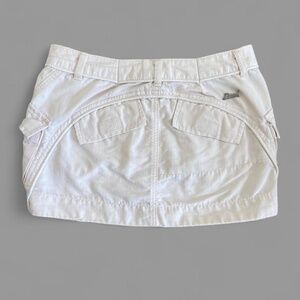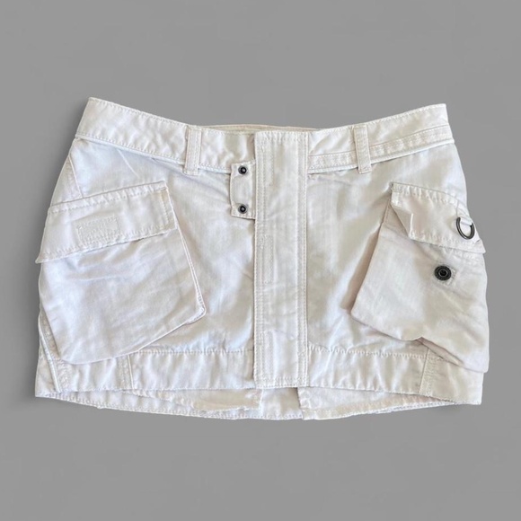 Cream colored cargo mini skirt from Diesel. There’s a small yellow stain on the front (as pictured). The skirt velcros completely open for you to put it on. I had it tailored from the marked size (26) to a size 24 (as shown). Although it could fit sizes 24-26 just depending on if you want it low-rise or high-rise.