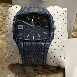 Stylish Diesel watch with denim look band. Never worn. Comes in original box.