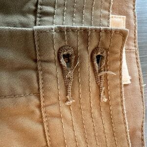 Diesel tan khaki Bermuda shorts with beautiful button detail in size 28. They are super cool looking. The length measures 28 inches, the waist measures 34 inches, and the hips measure 36 inches. I am not sure why the waist measures 34 inches with the tape measure and they are size 28. But they fit like a size 28