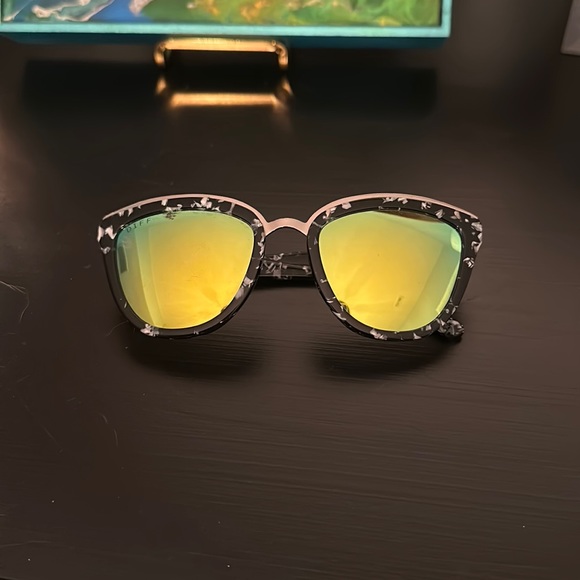 Good condition, only worn a few times sunglasses with reflective lenses from Diff. Very minuscule scratching on reflective coating of lenses not noticeable when wearing. But disclosing due to dissecting them super closely for sales purpose.