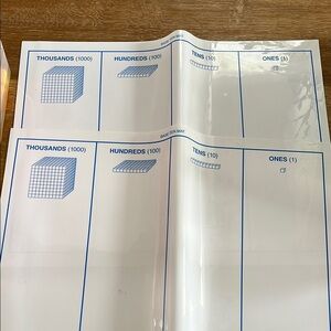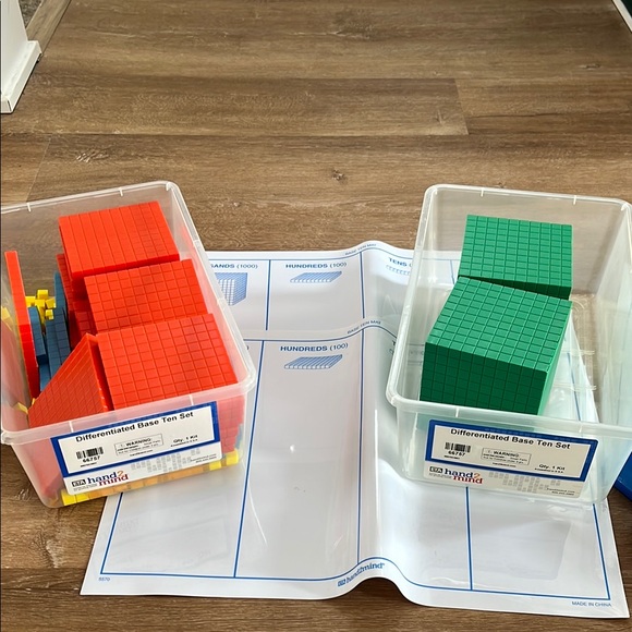 Differentiated base ten set featuring ones, tens, hundreds, and thousands, plus learning mats