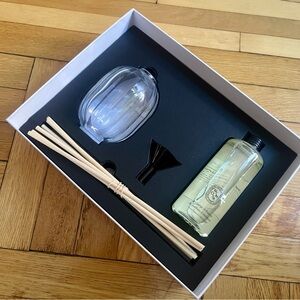 The set contains a glass bottle, a fragrance refill, six natural rattan sticks and a funnel to keep for future refills.