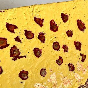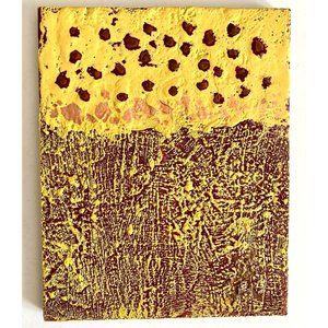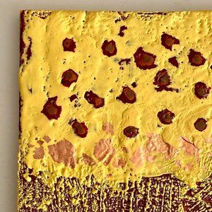 “Digging Deep” is an exciting original abstract handmade yellow, red-brown and copper textured encaustic wax painting by artist Tristina Dietz Elmes.