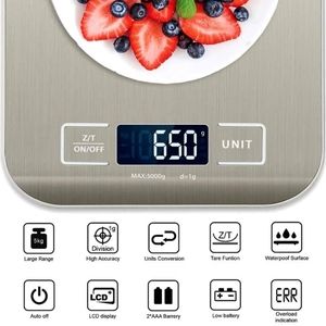 This digital food scale provides 6 units of g / kg / lb / water ml / oz / milk ml, especially including seperate ml measurement for milk and water. It has a LCD display with large screen that's backlit and is easy to read. It automatically powers off if not used for 2 mins to save power. You can put items anywhere on the scale and it will give an accurate weight from 1g / 0. 04 ounce to 5000g / 11lb.