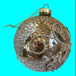 Dillard's Trimsetter Christmas Tree Ornament Glass Silver, Gold, Brown and White. Ornament is about 3.5" in diameter. It is decorated with beads, paint, gold leaf, silver leaf, and that form acorns and flowers, or flowers and buds. It is abstract and hard to tell what is depicted.