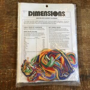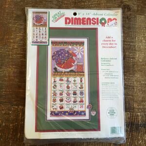 Dimensions 8466 Believe Advent Calendar Counted Cross Stitch kit. Designed by Mary Engelbreit. Finished size: 9" x 18". Package is open, kit is complete. Contains: embroidery thread, 14 ct white Aida, 14 ct plastic canvas, needle and instructions.