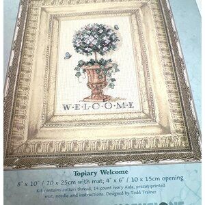 The Dimensions Matted Accents Topiary Welcome Cross Stitch Kit offers an elegant touch to any home décor. It includes a pre-printed design, cotton thread, and ivory Aida fabric, providing everything needed for a completed piece of art. This professional kit is designed by Todd Trainer.
