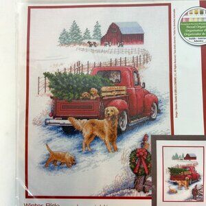 Embrace your inner artist with this Winter Ride cross stitch kit. Transform thread into a snowy scene complete with a retro red truck, a golden retriever, and a touch of nostalgia. It's like painting with thread but without the messy paintbrush.