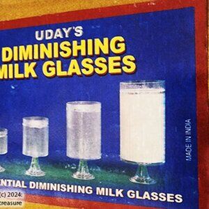 Diminishing Milk Glasses by Uday. ( UDDIMINISHINGMILK ) Trick. Difficulty:No Skill Required. Date Added: 4/13/2011. Weight (lbs): 0.735. Dimensions: 11.0 x 4.8 x 4.8. Brand New: As is, no returns. See photos for details and visual description. Four different sizes transparent glasses are displayed. Milk is filled into the smallest glass. Then it is poured in to the second glass to fill it completely! Then it is poured into the third glass to fill it completely!! Then the milk is poured into the largest glass, to fill it completely!!! The same effect can also be shown in the reverse procedure.