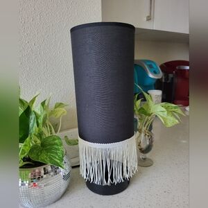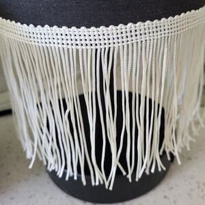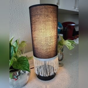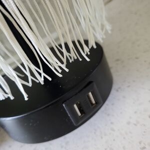 Mid-Century Modern with Boho ivory fringe update. Contemporary (with a vintage-inspired twist). 3-way dimmable, USB ports, AC outlet
