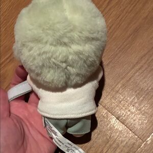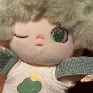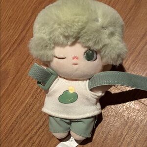 Cute green plush wrist buddy for kids. Soft fabric and secure adjustable strap for comfortable wear. Adorable winking face adds playful charm. Easy to carry and great for imaginative play.