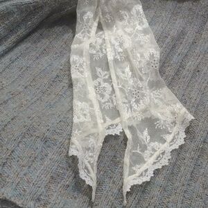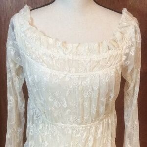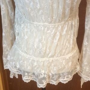 Beautiful ivory Victorian flower pattern lace long sleeve pullover top that can be worn off the shoulders. There is elastic around the neckline with a ruffle and elastic under the bust and the waist. Sleeve cuff delicately flows over your hand and fingers with a slit opening. Fabric is 100% nylon. Measurements: Bust 20" across, sleeve length 26" and length 21". In like new excellent condition.