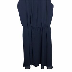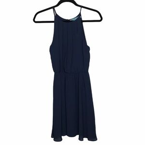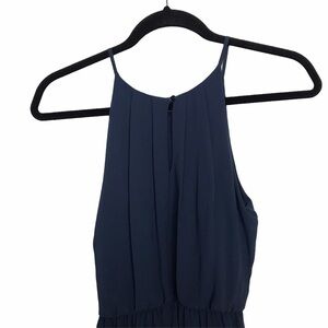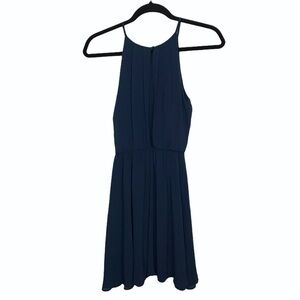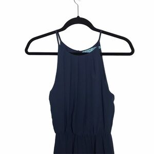 Blue, flowy sleeveless dress with halter style neckline. Has pleat detail on bodice, elastic waistband, and keyhole back with button. Lined. Preowned but in great condition.