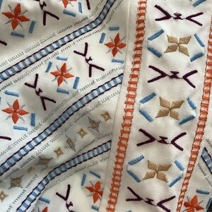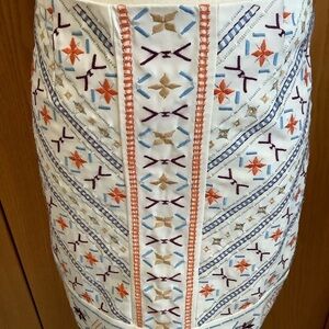 Cute mini skirt with a cream background and colorful embroidery detail. Back zipper and eye n hook closure. Approximate measurements laying flat: waist 15” across and length 18” and hips 18” across. In excellent worn condition. No stains or holes.