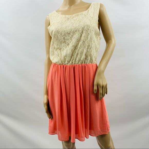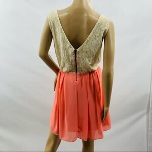 Dina Be Low Back Mini Dress. Cream lace top with Coral Skirt. Fully Lined with back zipper.
