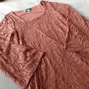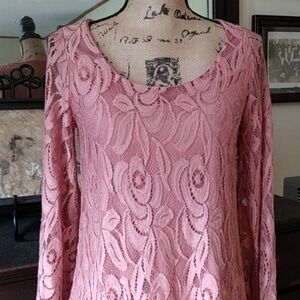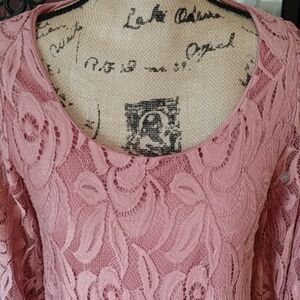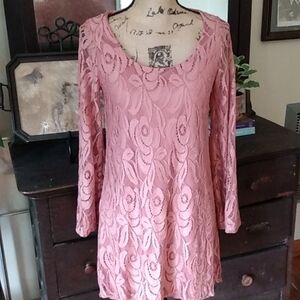 Dina Be/Francesca's Collection mauve-pink floral lace overlay dress. Sleeves are long, sheer and bell. Figure flattering A-line cut. Pit to pit 16". Waist lay flat 16". Length 33". In EUC.