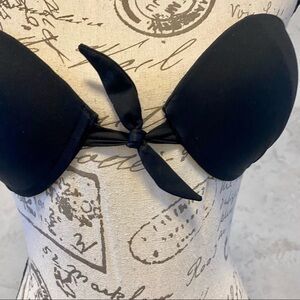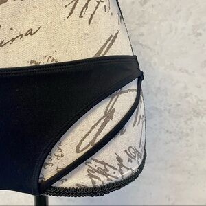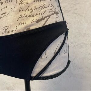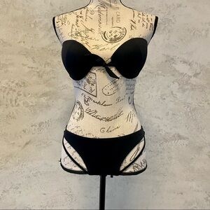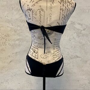 Dineila Brazil bandeau bikini in black with molded cups and a tied knot closure. The bottoms feature four sexy attached straps and minimal back coverage with ruching. Size tags are missing but is listed as a Small. *See photos for approximate measurements. Gently worn and in good condition.
