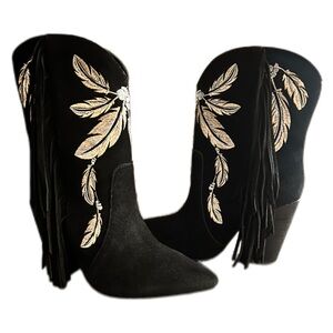 Dingo Black fringe Boots with Cream Feather Embroidery NWOB