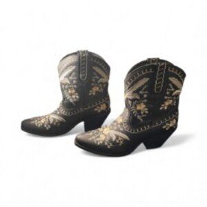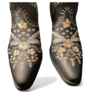 Dingo DI748 black leather western boots featuring intricate gold and ivory floral embroidery throughout. These stunning cowgirl boots bring vintage charm with a touch of modern elegance. Perfect for concerts, festivals, line dancing, or adding feminine western flair to any outfit!