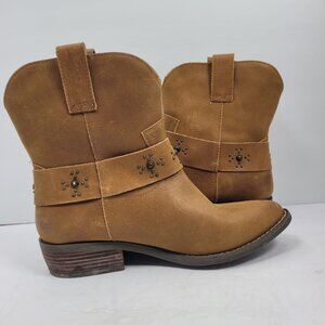 Step into style with these Dingo Western Ankle Booties, featuring a rugged leather upper and sleek camel color. Designed for durability and comfort, these booties are a chic addition to any wardrobe. The studded accents and ring detail add a touch of flair, perfect for casual outings or more polished looks.