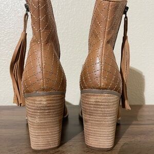 Stylish tan booties with side tassel. Quilted detail on heel. Perfect for versatile wear.