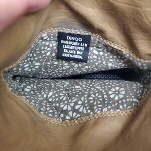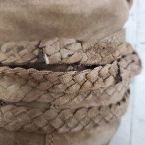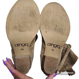 Buffalo Tan. Slight slouch style. Harness/Braided straps. **Some glue showing on braids, but hard to see within the boot as a whole. Block heel. Suede leather in beige/tan. Fabric lining inside boot. Dingo is known for quality and comfort! Minimal wear, slight marks on toes, goes with the distressed look of the boot. In excellent used condition! Color matches everything!