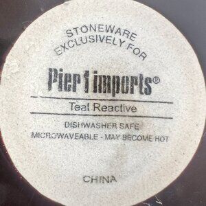 These dinner plates showcase a reactive glaze finish, offering a unique blend of teal and ivory tones. Crafted exclusively for Pier 1 Imports, the plates are both dishwasher safe and microwaveable. Their 11-inch diameter makes them suitable for serving various meals, adding an elegant touch to dining settings.
