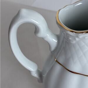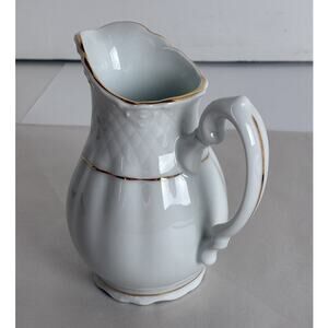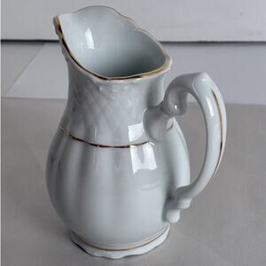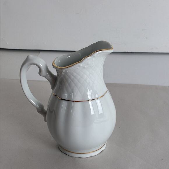 Dinnerware Creamer S. Paulo Brazil Pattern Vilma Fine China 1940s Vintage. Th top of the creamer is a basket weave pattern and the rest is a wavy pattern. There is gold trim on the handle, around the middle and on the top of the creamser. There are no chips or cracks. The creamer measures 5.5 inches tall.