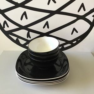 -Gently used set includes:4 large plates, 3 bowls, 4coffee mugs