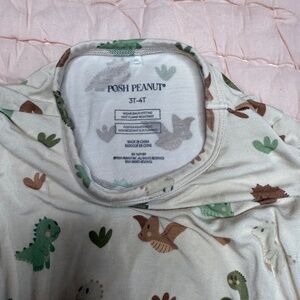 GUC dinosaur long sleeve pajamas. There is one very small pin hole and one stain on the cuffs of one of the arms - pictured. Sized 3-4T.