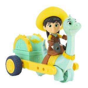 Howdy! Let’s get ready to join Min and Clover with the attached Care Cart on an adventure! This fun vehicle features a 5” Dino vehicle Clover and the 3” Dino Rancher, Min, with a removable hat. Min is the dino doctor-in-training and Clover is her dino best friend, a gentle and loveable brontosaurus. Clover helps Min by pulling the ‘care cart.’ Watch Clover’s head bobble as he moves! The cart chest opens so that your little dinosaur enthusiast can store all sorts of treasures! There are three styles to collect: Min & Clover with attached Care Cart, Jon & Blitz with attached Chariot, and Miguel & Tango with attached Tow Rig. Collect them all and watch your child recreate their favorite scenes from the hit children’s show, Dino Ranch. Plus, these kid’s toys make great additions to your little rancher’s growing stable of pre-westoric friends! Dino Ranchers Ride!