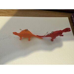 Unique and playful jewelry, this set features mismatched dinosaur earrings that are sure to add a quirky touch to any outfit. One earring showcases a vibrant red T-Rex, while the other features a bright orange Stegosaurus. Each dinosaur is meticulously crafted, dangling from secure metal hooks. These earrings are perfect for adding a fun, whimsical element to your everyday style, making a statement at casual gatherings, or gifting to the dinosaur enthusiast in your life.