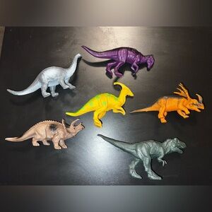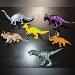 These toy figures represent a mix of herbivorous and carnivorous dinosaurs, each with distinctive features used to identify their real-life counterparts.