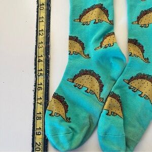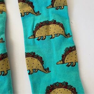 Fun teal socks with a playful dinosaur print in yellow.