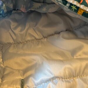 dinosaur print. As shown, pockets , teething ring attached, empty loop addd toys etc , clean laundered stores easy in car etc