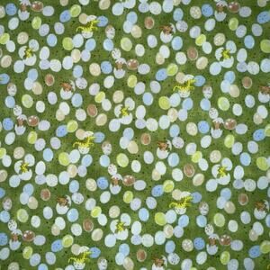 Dinosaurs & Eggs - Dinosauria by Studio K for Clothworks - Green background with baby dinosaurs, eggs, and hatching dinosaurs in shades of green, brown, white, and blue print.