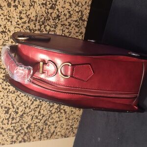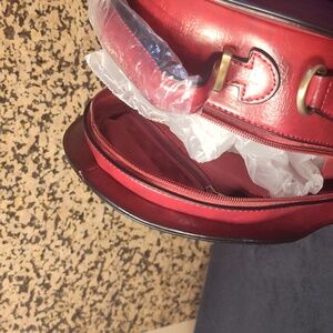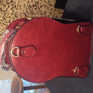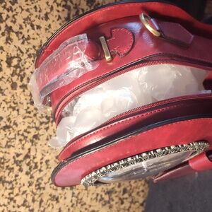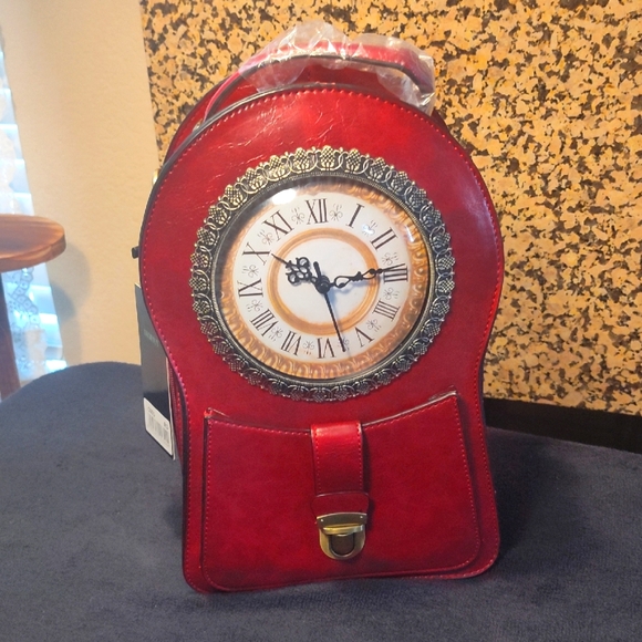 Stylish red backpack featuring a unique clock design. Perfect for making a statement.