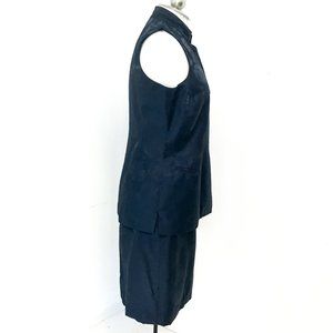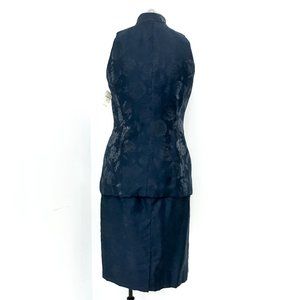 Rare Designer Petite! Vintage 80s Christian Dior formal knee-length skirt & sleeveless jacket. Dark navy jacquard - shine reveals subtle champagne metallic roses floral print. Longline high neck - room to custom tailor. Fab for mother of the bride, evening party attire. NWT Unworn