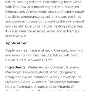 formulated for all skin types including sensitive skin and even acne prone skin, to restore skin firmness and elasticity. The natural healing properties of Red Seaweed builds an age defying barrier, while improving the skin’s ability to draw in and balance moisture. Red Caviar is a very potent ingredient rich in Vitamins, Minerals and Amino Acids to fight the signs of aging. Red Caviar + Red Seaweed is a hydrating facial treatment while calming skin and smoothing surface lines and wrinkles.