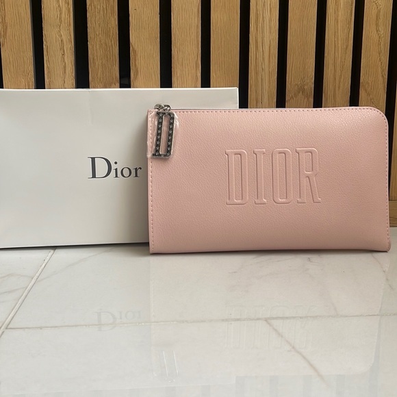 Dior Clutch Makeup Bag is absolutely gorgeous! It’s a beautiful blush pink color with a silver zipper and D zipper pull keychain.