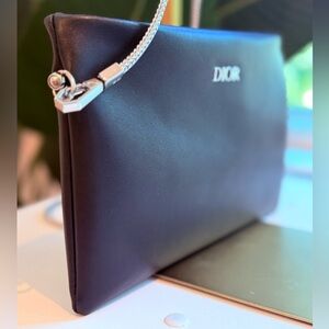 This Dior beaute pouch has been transformed into a stylish crossbody bag featuring an unbranded chain. It boasts a top zipper closure and silver-toned hardware. The chain is removable, allowing you to use it as a clutch.